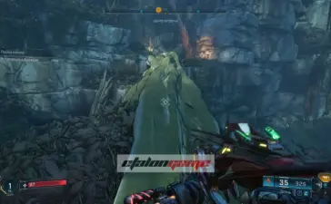 Дальше идите по тропе к тыльной стороне локации и снова цепляйтесь крюком. Затем продолжайте путь и перебирайтесь через дерево к площадке с водопадом.