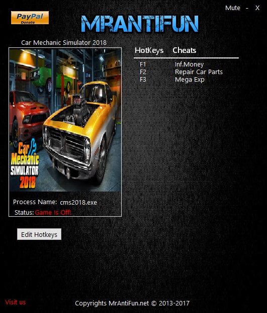 Чтобы отремонтировать выбранные части автомобиля, сначала снимите любую часть автомобиля, затем активируйте чит и поставьте её назад, вы должны сделать это на каждом новом автомобиле.