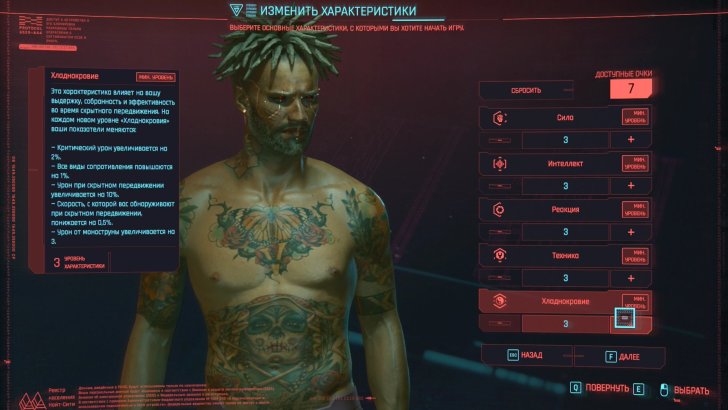 Хладнокровие — управляет деревьями способностей скрытность и невозмутимость. Позволяет выбрать хладнокровные варианты в некоторых диалогах. Увеличивает критический урон, повышает все виды сопротивления, увеличивает урон при скрытном передвижении, урон от моноструны, понижает скорость обнаружения врагами при скрытном передвижении. Если хотите быть скрытным и наносить урон из теней освещённого неоновым светом Найт-Сити, эта характеристика для вас.