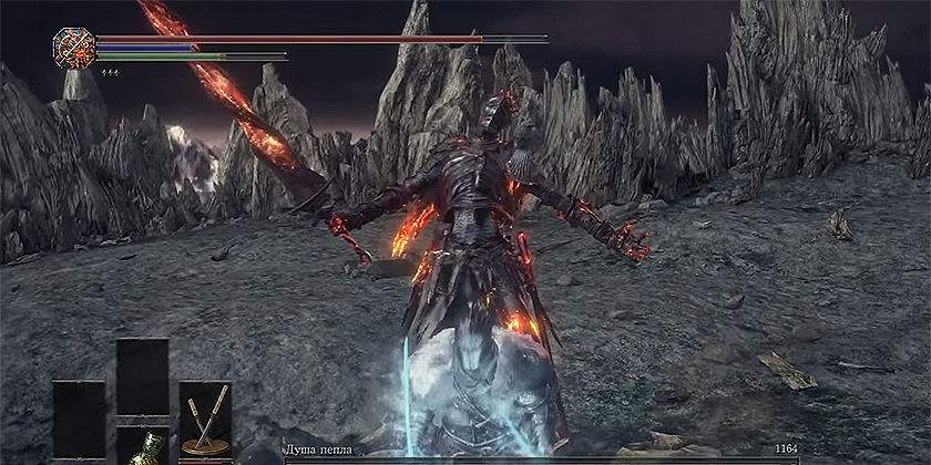 Борьба с Душой пепла состоит из двух фаз. В первой фазе он время от времени четыре раза меняет оружие. Эта фаза длится, пока Вы полностью не исчерпаете его здоровье. Во второй фазе босс использует похожее на меч оружие и метает в Вас световые заряды.