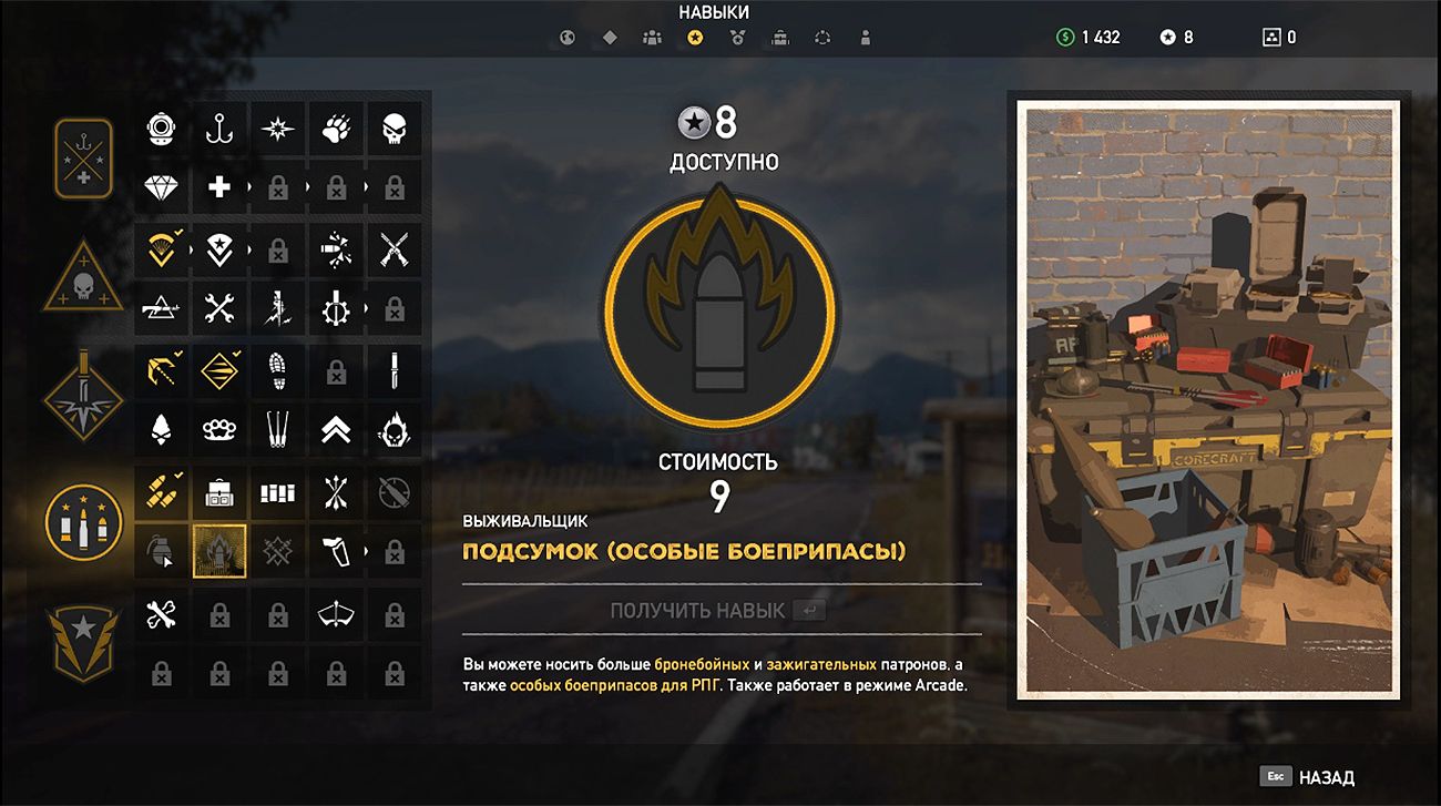 «Чёрный рынок» (Спец по выживанию, 6 очков) — основной потенциал этого навыка — это доступ к особым типам боеприпасов (например, зажигательным), которые могут быть полезны при уничтожении вражеского транспорта или сектантов с мощной бронёй. В магазинах теперь будут доступны: взрывчатка с д/у, бесконтактные мины, коктейли Молотова, СВУ, «липкие» гранаты и динамит.