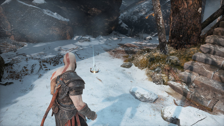 Продолжайте охоту с Атреем, пока не доберётесь до большой круглой каменной плиты на земле, путь которой разветвляется на 3 направления.