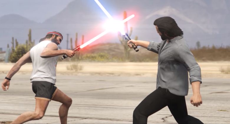 Небольшое отступление от канона: герои GTA5, Тревор и Майкл сошлись в схватке на лазерных мечах с матерщиной и оскорблениями. Оружие, возможно, из более цивилизованной эпохи, эти двое — нет.