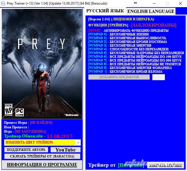 Prey Читы/Трейнер/Trainer +13 Baracuda [1.04 — Update 13.08.2017 — 64 Bit]