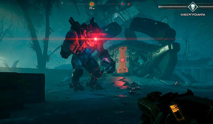 - Стреляйте в светящуюся синюю панель на груди Кибергромилы.