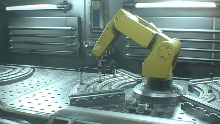 После этого путь обратно в безопасную комнату будет без происшествий. Поднимитесь по лестнице снова в комнату синтеза вакцин. Объедините два образца и взаимодействуйте с устройством. Теперь вы должны решить головоломку.