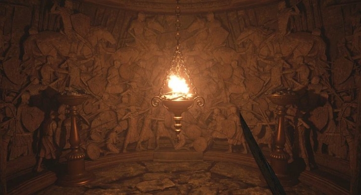 Для этого нужно подойти к факелу, пока он не коснётся каждой жаровни. Это кажется немного странным, особенно от первого лица, но оказывается, что удар головой о висящий предмет действительно может решить загадку.