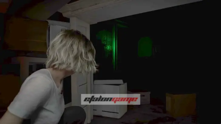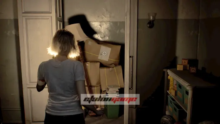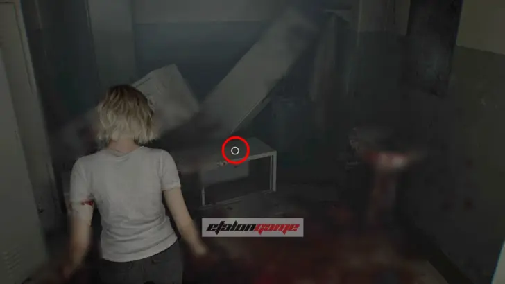 Забрав отвёртку, можно сразу укрыться, если не успеваете уйти. Для этого пригнитесь и пролезьте под наваленными предметами у противоположной стороны комнаты. Когда монстр зайдёт внутрь и сместится влево, пригнувшись, выберитесь через боковую дверь и попробуйте пройти по коридору в сторону комнаты сохранения.