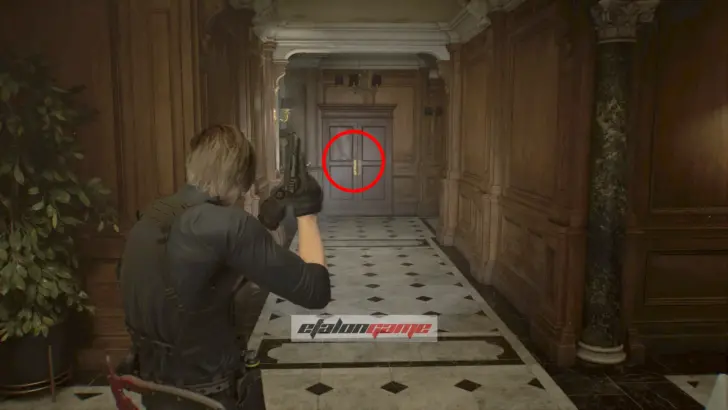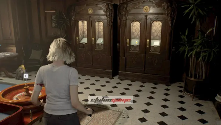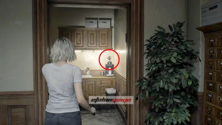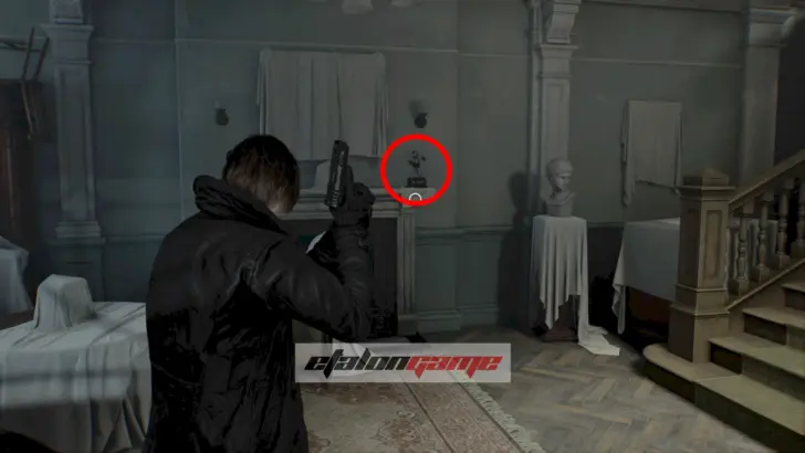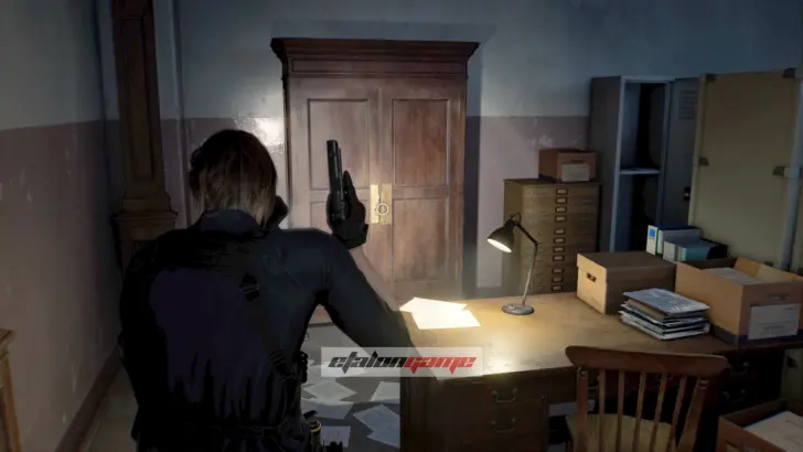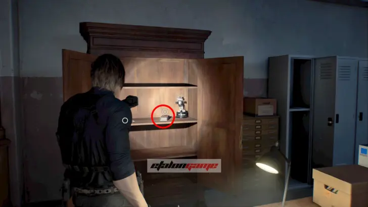 Архивный отдел: фигурку слышно в этой комнате. Она спрятана в шкафу, который только Леон может разбить своим топориком.