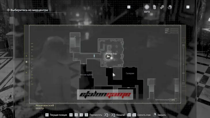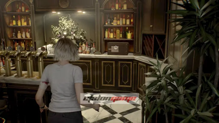 Далее можно пройти по коридору, который открывает ранее запертую дверь возле бара и лаунж-зоны, а затем спуститься по лестнице слева. Будьте осторожны: зомби на ступенях может превратиться в Пузыреголового, если подойти слишком близко. По возможности его лучше обойти, если нет лишних патронов на бой.