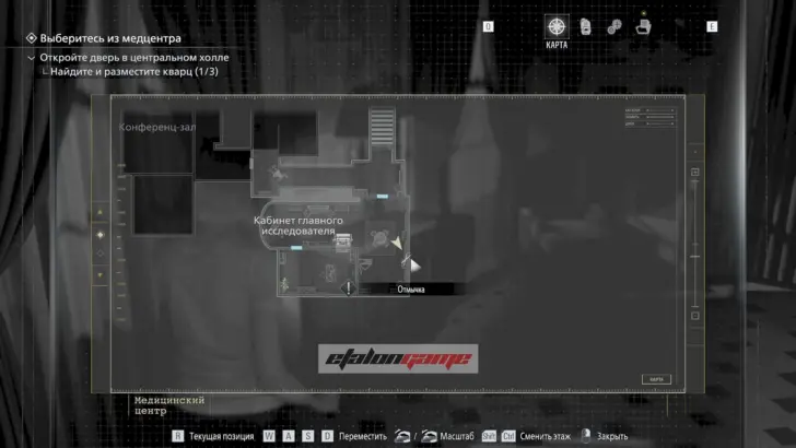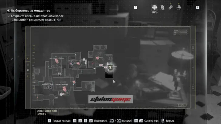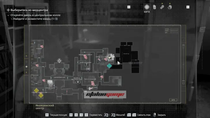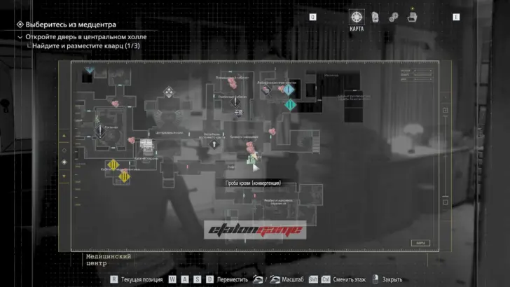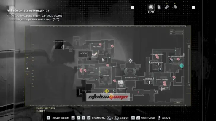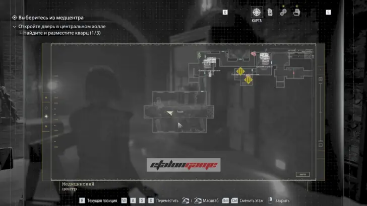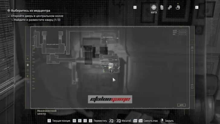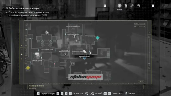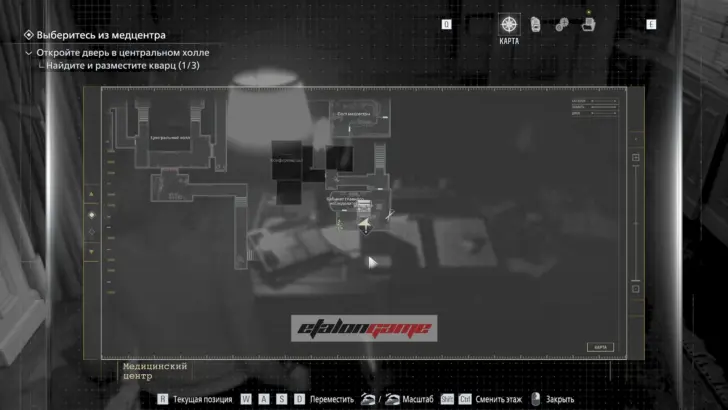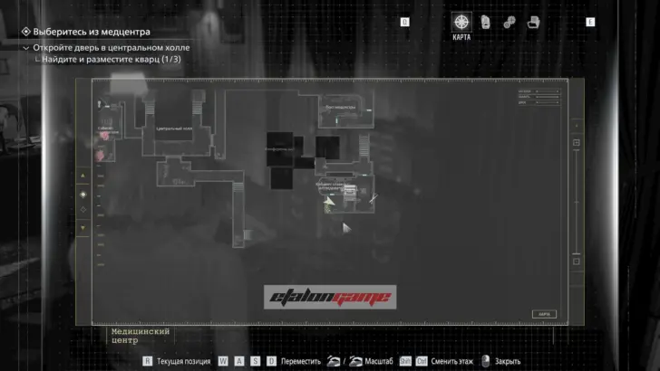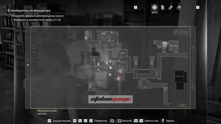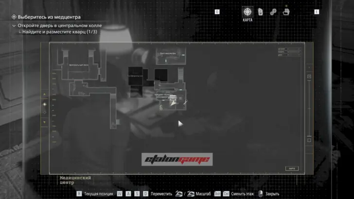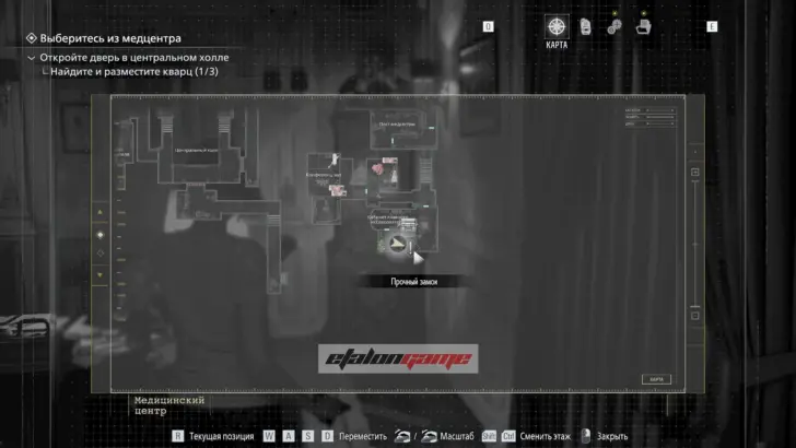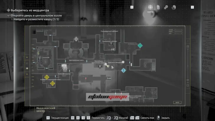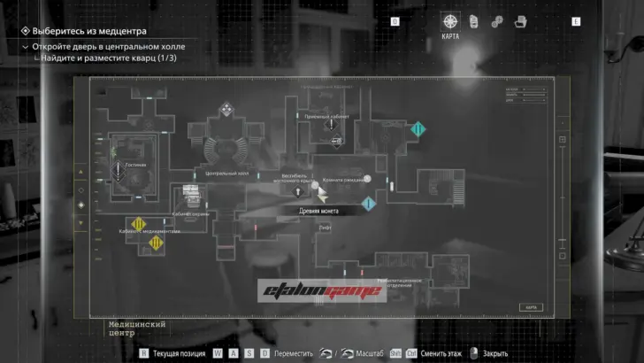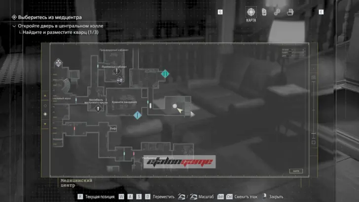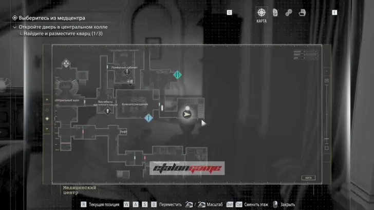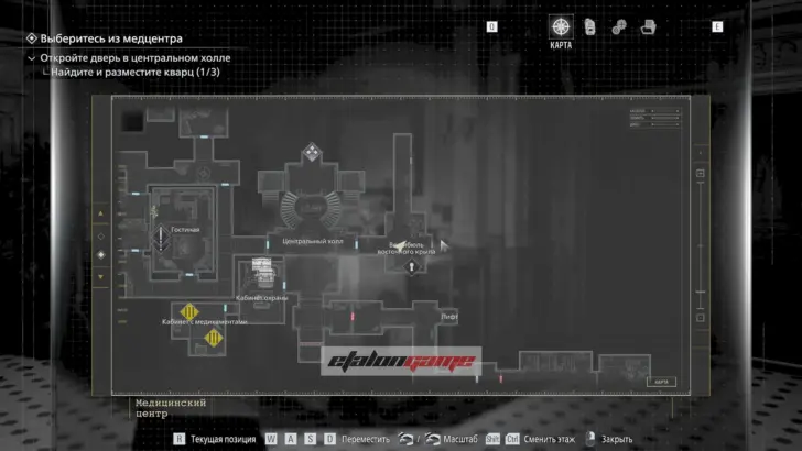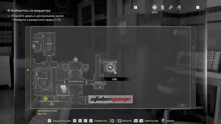 Главная цель на этом этапе — собрать три кварца и открыть ими дверь в Центральном холле. После подбора можно складывать кварцы в ящик предметов либо сразу вставлять их в дверь по одному.