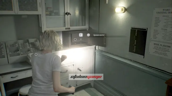 Пост медсестры: заберитесь на тележку слева и возьмите монету с верхушки шкафчика. Сделайте это до того, как передвинете тележку вправо.