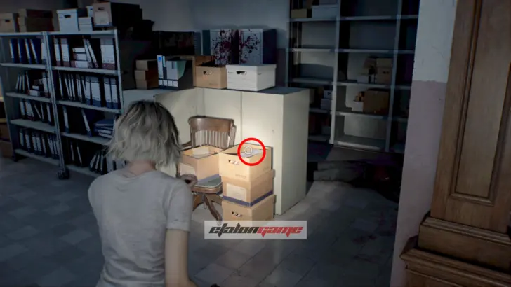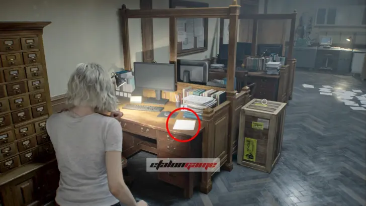Архивный отдел: зайдите в комнату справа от офиса. Документ лежит в картонной коробке у конца среднего ряда стеллажей. Здесь же будет слышен Мистер Енот в шкафу, но открыть его пока нельзя, придётся вернуться позже. Также остерегайтесь двух зомби в помещении.
