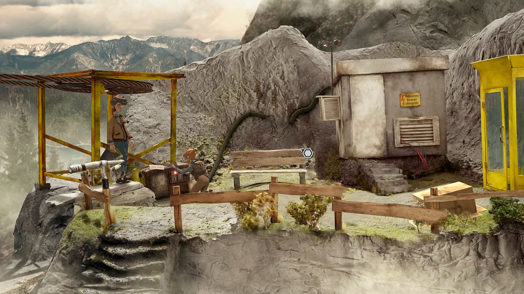 В центре площади находится статуя рыцаря. Примените на нём консервный нож и наденьте броню. Поднимитесь наверх к фуникулёру и взаимодействуйте с проводами на заднем плане, чтобы соединить их вместе. Кабель отремонтирован! Подойдите к девушке и примените ключ от канатной дороги к генератору. Теперь остаётся только достать средство для передвижения по канатной дороге, поскольку здесь нет кабинок. Примените те две вешалки, найденные ранее. На этом первая глава заканчивается.